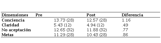 Para llevar a cabo el análisis de los resultados se utilizó del programa SPSS. Los puntajes globales señalan un promedio en el pretest de 41.77 y en el post 39.63 una disminución de 2.14 puntos en la desregulación emocional. Los puntajes del límite inferior (pre=37.92, post=35.96), superior (pre=45.63, post=43.32), máximo (pre=76, post=72) y rango (pre=53, post=47) disminuyen del pre al post test. Los datos descriptivos sugieren que hubo mayor regulación emocional por parte de los participantes de la sesión uno a la cuatro. Los puntajes por dimensión se observan en la tabla 1, la dimensión conciencia es la que presenta mayor diferencia (1.16) de puntos, lo que significa que los participantes fueron más conscientes de su estado emocional al finalizar las sesiones, la dimensión con menor diferencia de puntaje fue claridad (.49), significa que los participantes a pesar de ser conscientes de sus emociones consideran que estas le sobrepasan o no tienen claridad en relación con sus sentimientos.