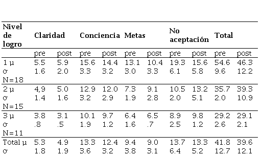 En el caso del grupo 2, los medios, no reportan diferencias estadísticamente significativas. Lo que quiere decir que se encuentran en el desarrollo de habilidades de regulación emocional, que posiblemente requieren más tiempo para su adquisición y práctica. En el grupo 3, los bajos, las personas difieren significativamente en claridad con un índice de T=.039. Esto quiere decir, que los participantes adquirieron recursos para identificar con mayor detalle aquello que estaban sintiendo, que facilitará o dificultará su regulación emocional.