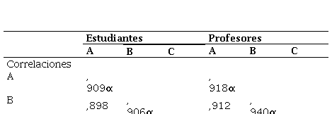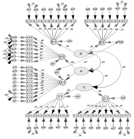 En cuanto a la carga factorial de los ítems: en la dimensión A, los ítems tienen cargas factoriales por arriba de 0,48 en el caso de los estudiantes y de 0,39 en el caso de los profesores. El ítem más bajo que se reporta en el caso de los profesores es A.1.8, coinciden con un valor bajo únicamente en el ítem A.2.7. Por su parte, la dimensión B muestra cargas factoriales más altas que la A pues el valor más bajo es de 0,54 y 0,52, respectivamente. En el caso de los estudiantes el ítem más bajo es B.2.7 con un valor de 0,54 y en el caso de los profesores es en B.1.1 con 0,052. Coinciden en cargas factoriales bajas en los ítems B.1.1 y B.1.2. Por último, la dimensión C tiene cargas factoriales aceptables en todos los casos, en efecto la carga más baja es de 0,58 y 0,59 respectivamente en el ítem C.1.1. Las estimaciones del modelo tanto para estudiantes como para los profesores son aceptables por lo que se conservan todos los ítems.