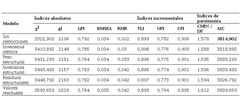 Para asegurar la calidad del modelo de invarianza factorial, también se consideró algunos ajustes a través del modelo de mínimos cuadrados no ponderados (ULS) que está basado en las correlaciones policóricas. Los resultados demostraron que, con este método, también existe un buen ajuste a pesar de que no se dispone del índice CFI. El índice de ajuste absoluto GFI, en todos los casos estuvo sobre 0,950, mientras que, RMR obtuvo un valor menor que 0,03. Por su parte, el valor incremental de NFI también obtuvo ajustes por arriba de 0,950. Las diferencias son mínimas el modelo sin restricciones con respecto a los modelos con restricciones.