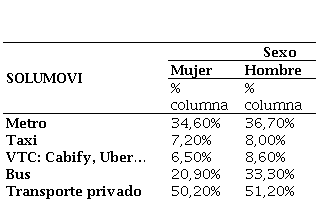 Para el taxi la mediana es de 45 años con un rango de 49 años. En el caso del VTC la mediana es de 27 años, con un rango asociado de 44 años. El autobús tiene una mediana de 32 años, con el rango de mayor distancia (73 años). La movilidad en transporte privado cuenta con una mediana de 34 años y un rango de 58 años. Finalmente, en el caso de las otras alternativas no contempladas la mediana se encuentra en 43 años, con un rango de 45 años. Así mismo, se analizó la posible existencia de diferencias por género a la hora de elegir la solución de movilidad preferida (tabla 2), pero no se encontraron variaciones significativas en las preferencias según el género de los participantes (X2= 12,4; p = 0,054).