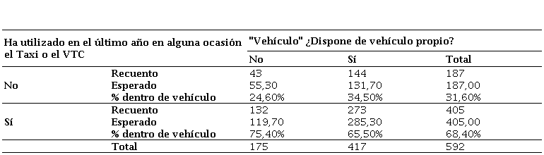 Finalmente, se estudió la relevancia de disponer o no de vehículo propio a la hora de utilizar el servicio del taxi o del VTC, siendo X2= 5,66, p = 0,017. Se pudo concluir que existe cierta correlación entre la utilización del taxi o del VTC y la disposición de un vehículo propio (tabla 3). El 75,40% de los usuarios que no disponen de vehículo propio utilizaron el taxi o el VTC, mientras que, el 24,60% no utilizó el servicio. Por otro lado, el 65,50% de encuestados que sí disponen de vehículo propio utilizaron el taxi o el VTC y el 34,50% restantes no lo utilizaron. En este sentido, el número de usuarios esperados según la probabilidad estadística en caso de no asociación o independencia entre variables viene dado por la ecuación Esperado = (TotalFila*TotalColumna) / Total, observándose una diferencia de ±12,30 usuarios para cada una de las diferentes situaciones.