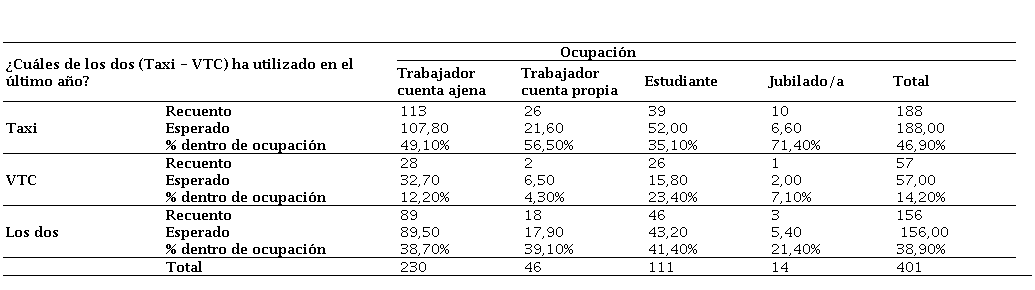 Se puede observar que los usuarios de mayor edad emplean más el servicio del taxi, mientras que, las personas de menor edad utilizarán más el VTC o ambos servicios. También, se ha observado una asociación entre la ocupación y el uso específico de un servicio o el otro, X2 = 18,5; p = 0,005. En cualquier caso, como se puede observar en general, el uso del taxi ha sido superior (tabla 4). Los trabajadores por cuenta ajena y por cuenta propia se decantan principalmente por el taxi, con un 49,10% y 56,10%, respectivamente. Los estudiantes utilizan los dos servicios según conveniencia, pero la proximidad entre taxi y VTC es elevada teniendo en cuenta las grandes diferencias que encontramos en los otros conjuntos. Finalmente, con relación a la asociación a la que se hacía mención anteriormente entre las variables edad y tipo de servicio, se puede observar que las personas jubiladas presentan mayor predisposición al uso del taxi, con un 71,40%, frente al 7,10% de uso exclusivo del VTC.
