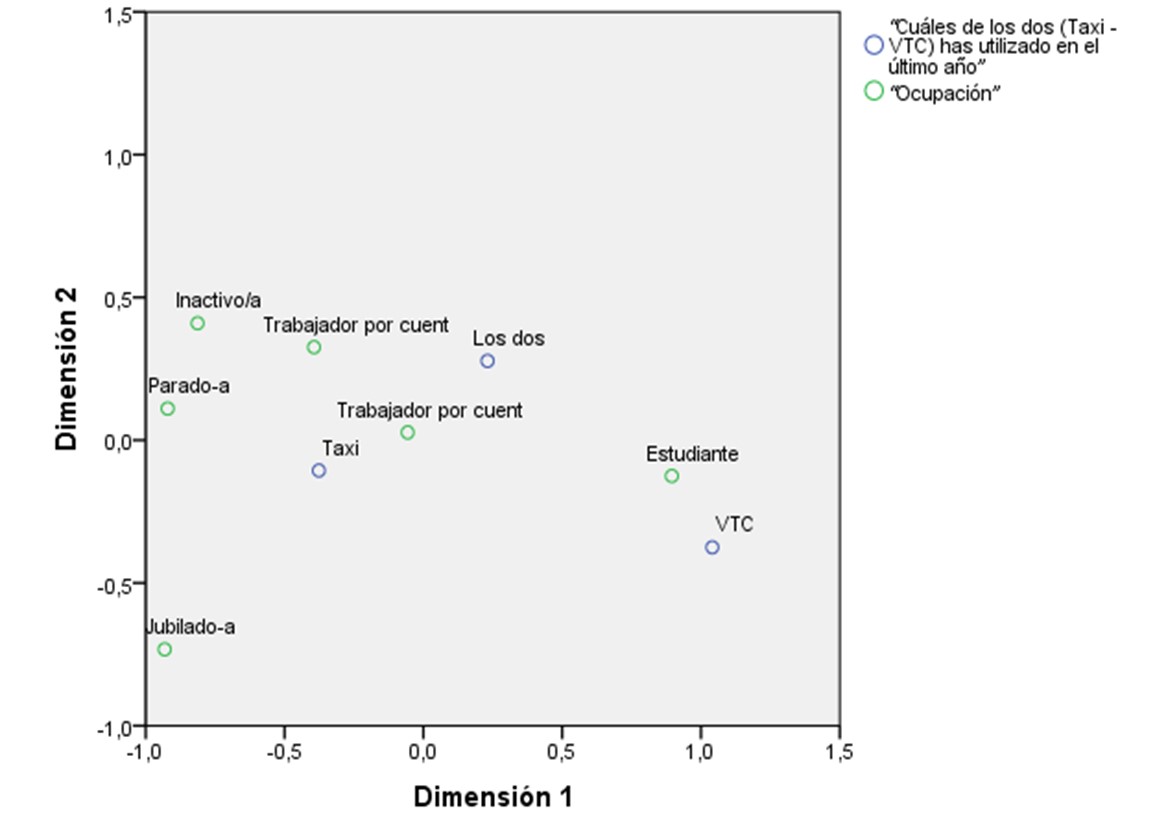 A la hora de diferenciar el perfil del consumidor del taxi y el VTC se han observado factores determinantes relacionados con la ocupación y la edad de los usuarios. Existe una asociación positiva entre la edad y la preferencia por el uso del taxi frente al VTC. Los usuarios con mayor edad se decantan por la utilización del taxi, mientras que, los más jóvenes prefieren utilizar el VTC. Del mismo modo, se ha observado que los trabajadores y las personas jubiladas tienen mayor propensión al uso del taxi, mientras que, los estudiantes suelen hacer uso del VTC. El análisis de correspondencias múltiples ha aportado una aproximación significativa de las variables: edad y ocupación con el uso del taxi y el VTC, reafirmando las conclusiones obtenidas en el análisis del resultado previo, matizando el probabilístico del uso combinado del taxi y el VTC en los trabajadores por cuenta propia y ajena.