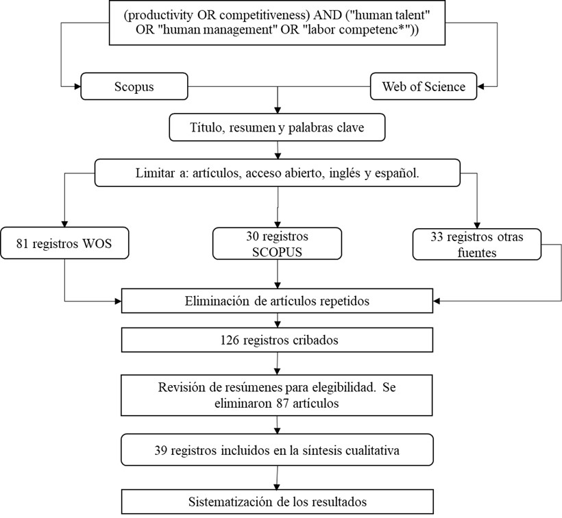Abstract: This research analyzes the competitive capacity of human talent in the current business context, through the application of organizational and labor competency models in the areas of human management. For this purpose, a literature review was carried out in the bibliographic databases Scopus and Web of Science, in the period 2002-2022, using the PRISMA methodology for the search refinement process. The analysis includes those studies that identify the incorporation of models for the formation of corporate, technical and technological competencies; innovation, achievement orientation, organizational learning, leadership, social responsibility and systemic integration between the operational and strategic. Among the conclusions, it is highlighted that the competitiveness of organizations is enhanced when they integrate innovation in personnel qualification processes, the creation of new ways of working and the updating of organizational management styles.