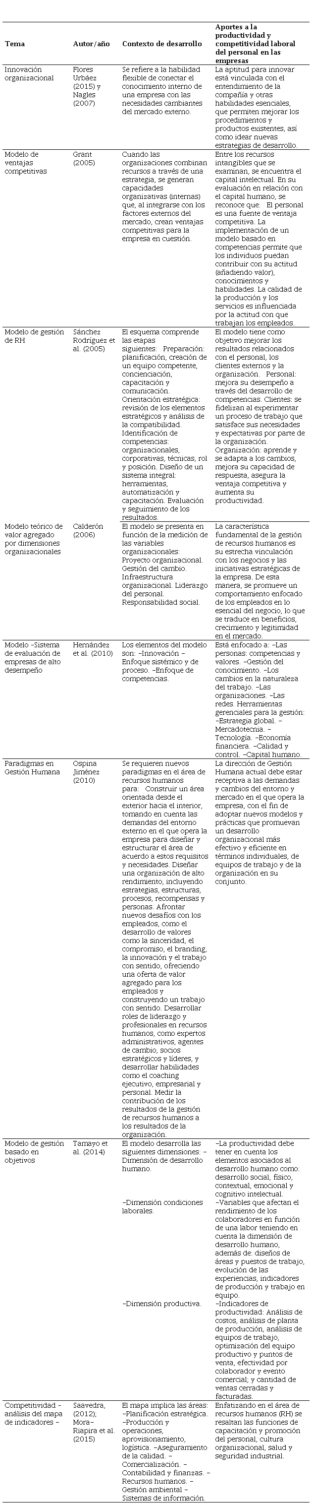 El análisis de la literatura consultada muestra tendencias importantes en el desarrollo de la gestión humana como base para afianzar la efectividad del personal en el trabajo, que incluye la integración de modelos teóricos en lo administrativo y lo estratégico, como insumo para el logro de las metas empresariales a partir del desarrollo de sus áreas; pues según se analiza en la mayoría de las investigaciones, un factor fundamental de la competitividad de las organizaciones, es la capacidad que estas tienen para administrar su talento humano (Maturana y Andrade, 2019; Vera-Barbosa y Blanco-Ariza, 2019). En la Tabla 4 se registran los hallazgos más relevantes a partir del estado del arte de los principales artículos (metodologías, modelos, herramientas, instrumentos, otros), sobre los aportes a la productividad y competitividad laboral del personal en las empresas.