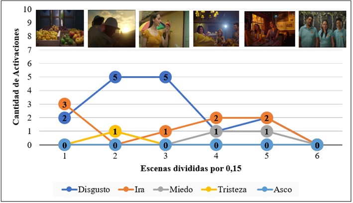 La actividad cortical estimulada durante la observación del video publicitario se recuerda en la parte superior y se localiza en la región frontal derecha, por tanto, existieron en algunos casos reacciones emocionales negativas, en particular el disgusto con un recuento de diez reacciones. Sin embargo, aisladamente en el contenido audiovisual existió escenas que mostraron emociones desagradables bajas.