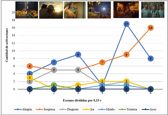 Sin embargo, la necesidad de conocer con mayor precisión su naturaleza y componentes justifica un mayor esfuerzo, para alcanzar el objetivo de la investigación que se orienta en indagar cuáles son las escenas de la publicidad digital de Origen Ambateño 2022 sobre la base de las expresiones faciales de las emociones básicas (alegría, sorpresa, tristeza, miedo, ira, asco, disgusto) que más llamaron la atención en la audiencia. Se identificó las escenas publicitarias que generaron reacciones emocionales positivas y negativas, seguido de la determinación de las zonas de interés según las orientaciones publicitarias de la campaña en las emociones positivas y posteriormente, el establecimiento de las áreas de orientación publicitarias de la campaña con las reacciones emocionales negativas.