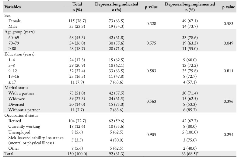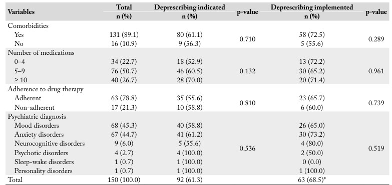 Overall, at least 1 psychotropic drug was indicated for deprescription in 61.3% (n = 92) of the participants, and it was effectively implemented in 68.5% (n = 63) of these patients. Age was the only significant sociodemographic or clinical difference between participants for whom deprescribing was indicated vs those in whom it was implemented. Deprescribing was more frequently implemented in the youngest age group (60 – 69 years) (p = 0.049) (Tables 1, 2).