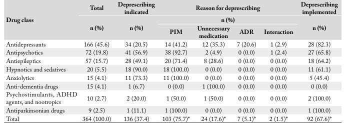 Deprescribing was indicated for 37.4% (n = 136) of psychotropic drugs, of which the main classes were hypnotics and sedatives (90.0%; n = 18) and anxiolytics (73.3%; n = 11). In both of these classes, all drugs were classified as PIMs. Among all drug classes, identification as a PIM was the main reason for deprescribing (75.7%) (Table 3). Deprescription of ≥ 1 PIM was indicated in 52% (n = 78) of the patients.