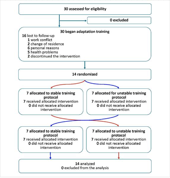 Before data collection, the researchers underwent the training protocol to ensure methodological rigor, in addition to evaluating the feasibility of methodological and operational procedures. The study took place in 2 stages: in the first, which lasted 2 weeks, the participants adapted to exercises in both the stable and unstable protocols. They were then allocated to a single experimental condition. The second stage consisted of 3 weeks of intervention in the allocated condition. At this stage, affective response data on the stable and unstable exercise protocols were collected (Figure 1).