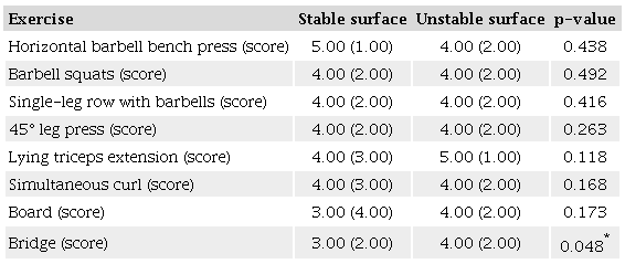 Results: Affective response was similar to the general affect observed at the end of the sessions (stable surface: 5.00 [3.00]; unstable surface: 5.00 [1.00]; p = 0.114), except for the bridge exercise (stable surface: 3.00 [2.00]; unstable surface: 4.00 [2.00]; p = 0.048]).