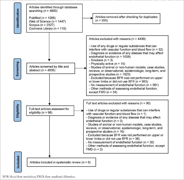 Figure 1 shows how reports were selected for the systematic review. Of the initially identified 4890 studies, only 6 trials reporting BFR and FMD at pre- and post-intervention conditions satisfied the eligibility criteria. Of those, one was conducted in Brazil, two in the Netherlands, and three in the United Kingdom.6,7,9,17,27,28 The trials were of moderate methodological study quality (all studies scored 6 points on PEDro scale), mostly because of the nature of BFR intervention – in general, groups were not randomized, and participants or researchers were not blinded to the BFR or exercise interventions.
