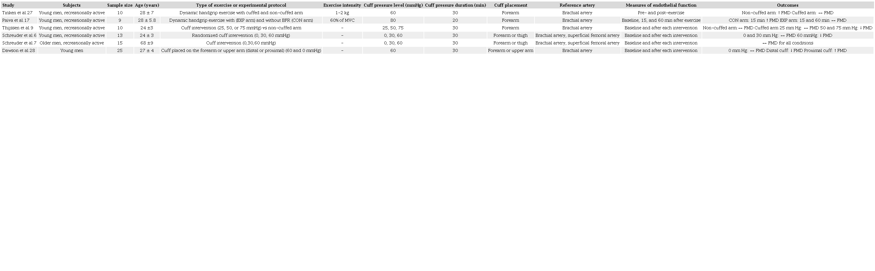 Table 16,7,9,17,27,28 depicts the characteristics and outcomes of the studies included in the systematic review. Two studies compared changes in endothelial function following exercise with vs without BFR and included, in total, 19 young men (aged 28 ± 7 years) who were healthy (no cardiovascular or metabolic disease and/or no use of any medication that could influence the cardiovascular system) and recreationally active (< 150 min/week of moderate-intensity physical activity or 75 min/week of high-intensity physical activity).17,27 Both trials applied low-intensity dynamic handgrip exercise (1 to 2 kg or 60% of maximum voluntary contraction), used moderate levels of BFR (60 or 80 mmHg) through cuffs placed on the forearms, and assessed the brachial artery vasodilation response. Cuff pressure duration ranged from 20 to 30 min, and the non-cuffed arm served as a control limb. FMD in the non-cuffed arm increased immediately27 and 15 min after exercise,17 while no significant change occurred in the cuffed arm.17,27 After 60 min, FMD returned to baseline values with no difference between limbs.17 No adverse effects were reported during exercise sessions.17,27