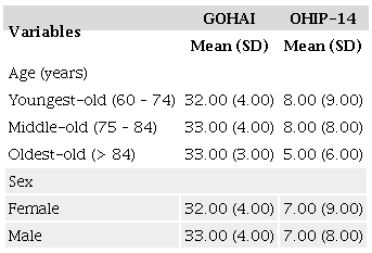 The participants’ mean (SD) age was 78.93 (9.10) years. Most were middle-old (aged between 74 and 85 years, n = 71, 36.80%) and female (n = 133, 68.60%). In addition, they reported a good OHRQoL according to the mean (SD) GOHAI and OHIP-14 scores of 32.53 (3.80) and 7.16 (8.17), respectively. Finally, OHRQoL values were similar across the age and sex groups (Table 1).