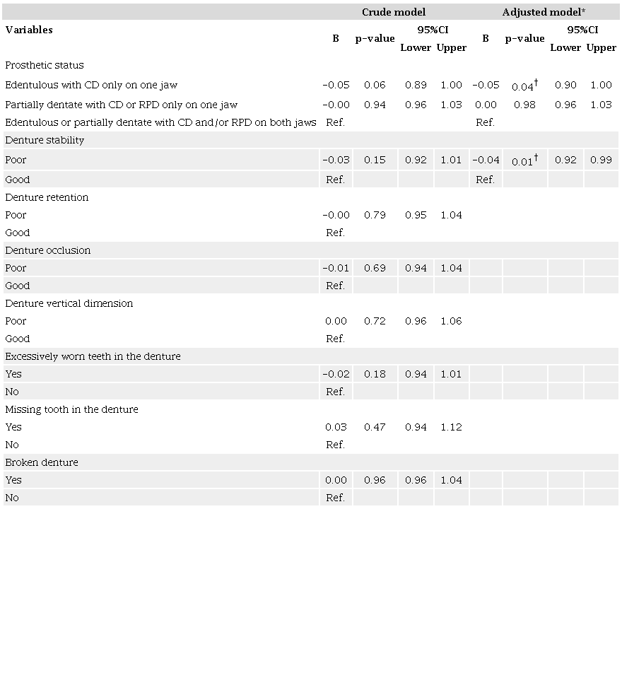 For the OHIP-14 model, the sequence of excluded variables was broken parts, occlusion, missing artificial tooth, and retention of the dental prostheses. Thus, the adjusted OHIP-14 model included the following variables: prosthetic rehabilitation status, stability, vertical dimension, and excessively worn teeth in dental prostheses. The variables gradually excluded from the GOHAI model were broken parts, retention, vertical dimension, occlusion, missing tooth, and excessively worn teeth in dental prostheses. Thereby, the adjusted GOHAI model comprised prosthetic rehabilitation status and stability variables. After the adjusted models were obtained, regression coefficients (B) and confidence intervals (95%CI) were used to measure the associations, considering a significance level of 5%.