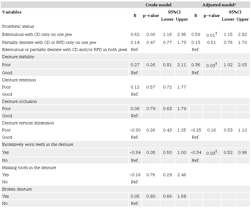 Results: Lower Geriatric Oral Health Assessment Index scores were associated with edentulism with denture use only on one jaw (B = -0.05) and poor dental prosthesis stability (B = -0.04). Similarly, edentulous participants with denture only on one jaw (B = 0.59) and those wearing dental prostheses with poor stability (B = 0.36) are more likely to achieve higher Oral Health Impact Profile scores. Also, lower Oral Health Impact Profile scores were associated with denture defects (B = -0.34).