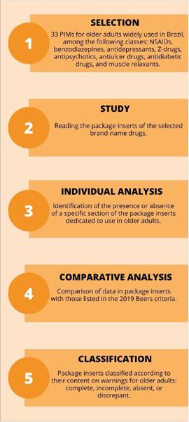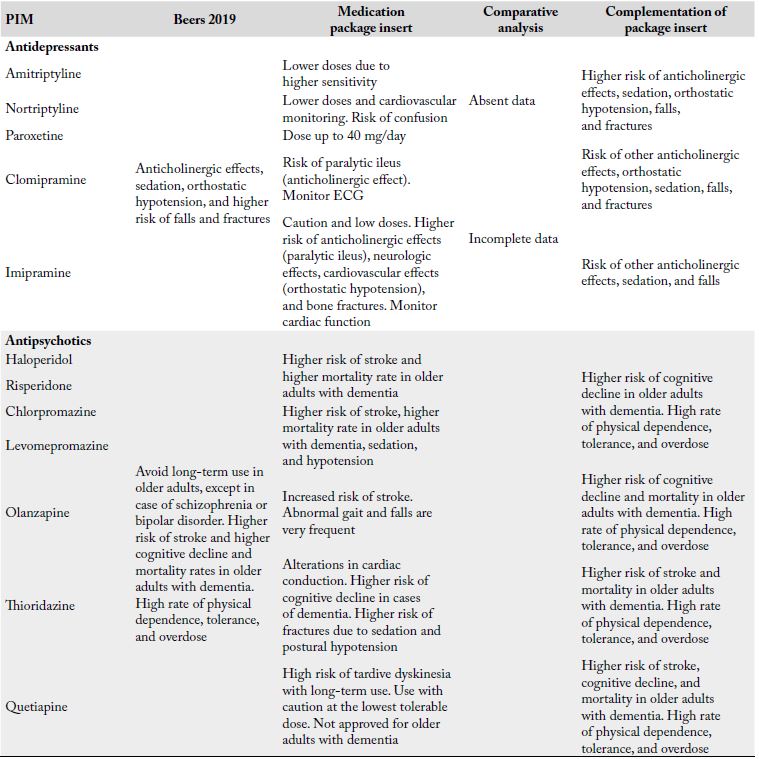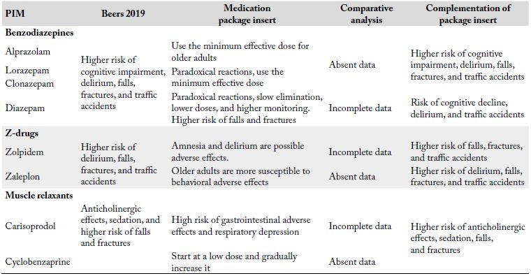 Conclusion: The analyzed package inserts presented incomplete data or lacked information characterizing the drugs as PIMs for older adults. This study demonstrated that some package inserts of drugs used in Brazil are not satisfactory, warranting higher caution in the medical community when prescribing these medications and guiding patients.