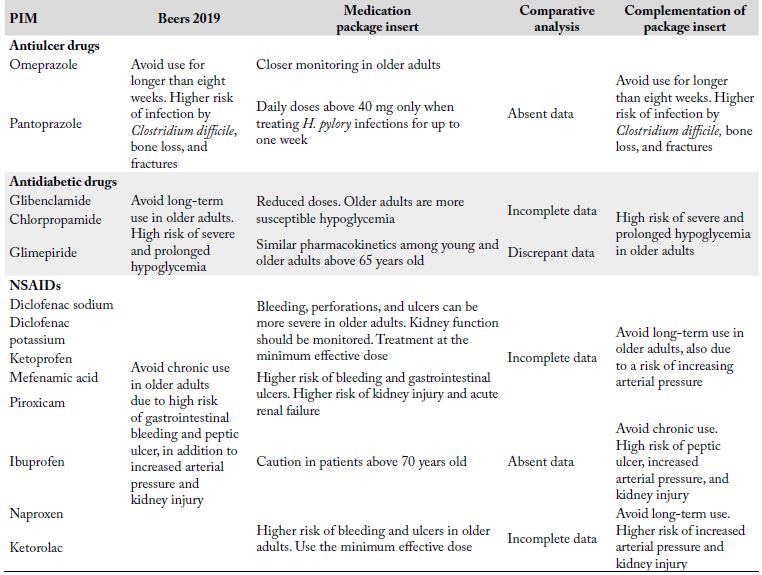 Methods: This is an observational, cross-sectional study that compared information on the package inserts of 33 brand-name drugs in the Brazilian market with specific recommendations for older adults contemplated in the Beers criteria, categorizing them into: complete, incomplete, absent, or discrepant.