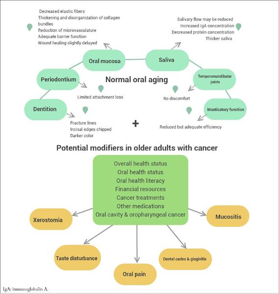 Oral health is complex. According to the FDI/World Dental Federation, it comprises the abilities to speak, smell, taste, touch, chew, swallow, and convey a range of emotions through facial expressions with confidence and without pain, discomfort, and disease of the craniofacial complex (head, face, and oral cavity).1 It is fundamental to overall health, as it contributes to quality of life, longevity, and functionality. It allows taste and smell, supports swallowing and nutrition, and maintains facial anatomy and self-esteem. Oral aging is especially relevant in the context of cancer, since it contributes to a lower threshold for developing oral disease, nutritional and swallowing disorders, taste and smell impairments, and chronic pain, as well as other adverse outcomes.2