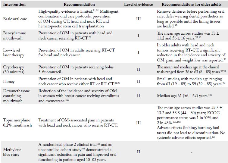 Even though research on the prevention and treatment of oral mucositis has gained relevance in the last decades, data for older patients is limited,89 and most decisions are extrapolated from evidence in younger adults. Recent guidelines recommend a holistic approach to patients at risk of oral mucositis, including participation of dentists, oncologists, and nurses.90 Interventions included in Table 177, 81, 90, 91, 92, 93, 94, 95, 96, 97, 98, 99, 100, 101, 102, 103, 104 have proven beneficial in the prevention and treatment of mucositis and are recommended by the Multinational Association for Supportive Care in Cancer (MASCC) and the International Society of Oral Oncology (ISOO).
