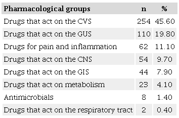 The CVS group included 221 (66.40%) antihypertensive drugs, 73 (21.90%) antiplatelet drugs, 27 (8.10%) hypotensive drugs, 4 (1.20%) vasodilators, 3 (0.90%) anti-vertigo drugs, 3 (0.90%) beta-blockers, and 2 (0.60%) anti-hemorrhagic drugs. The gastrointestinal group included 103 (99.00%) diuretic drugs, and 1 (1.00%) anti-prostate cancer agent. The pain and inflammation group included 55 (82.10%) non-steroidal anti-inflammatory drugs, 11 (16.40%) corticosteroids, and 2 (3.00%) antirheumatic drugs.