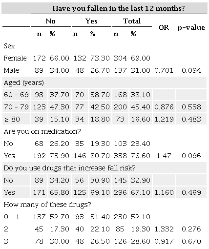 A total of 441 older adults aged ≥ 60 years were included in the sample. The collected data included sex, age, medication use (including those that increase fall risk), and the number of falls in the last 12 months. The pharmacological groups found are described in Table 1: 254 (45.60%) drugs that act on the cardiovascular system (CVS), 110 (19.80%) drugs that act on the genitourinary system, 62 (11.10%) drugs for pain and inflammation, 54 (9.70%) drugs that act on the central nervous system, 44 (7.90%) drugs that act on the gastrointestinal system, 23 (4.10%) drugs that act on metabolism, 8 (1.40%) antimicrobials, and 2 (0.40%) drugs that act on the respiratory tract.
