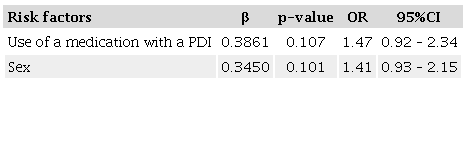 According to the logistic multiple regression model results (Table 3), using a medication with a PDI increased the odds of a fall in the last 12 months by 47.00%, with women having a 41.00% higher odds of falling than men. Therefore, sex and medication use were risk factors for falls. With an accuracy of 55.00%, the model indicated that, for every 100 patients, 55 with these characteristics had a fall in the last 12 months.