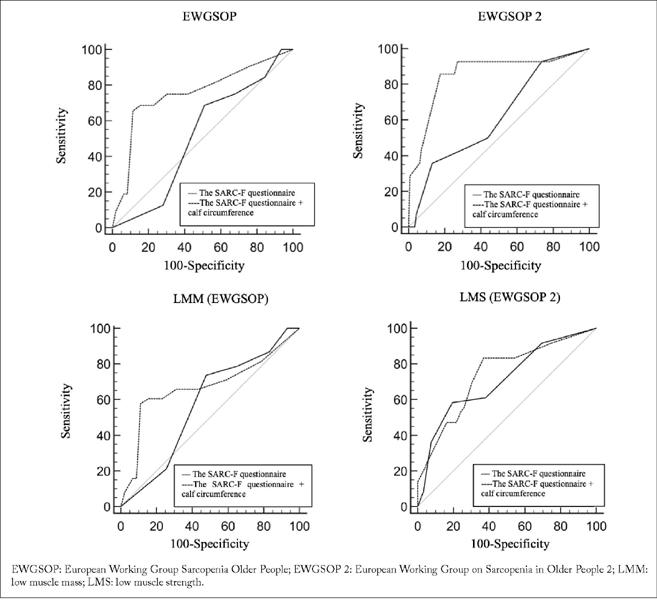 Results: According to the original and updated versions of the European Consensus criteria, the prevalence of sarcopenia was 25.00% and 10.90%, respectively. Sarcopenia risk was 17.20% according to the SARC-F and 23.40% according to the SARC-CalF. The sensitivity and specificity of the SARC-F ranged from 12.55% to 36.11% and 71.87% to 92.39%, respectively, while those of the SARC-CalF ranged from 47.22% to 85.71% and 82.46% to 88.89%, respectively. The area under the curve for the SARC-F and SARC-CalF varied between 0.51 and 0.71 and 0.67 and 0.86, respectively.