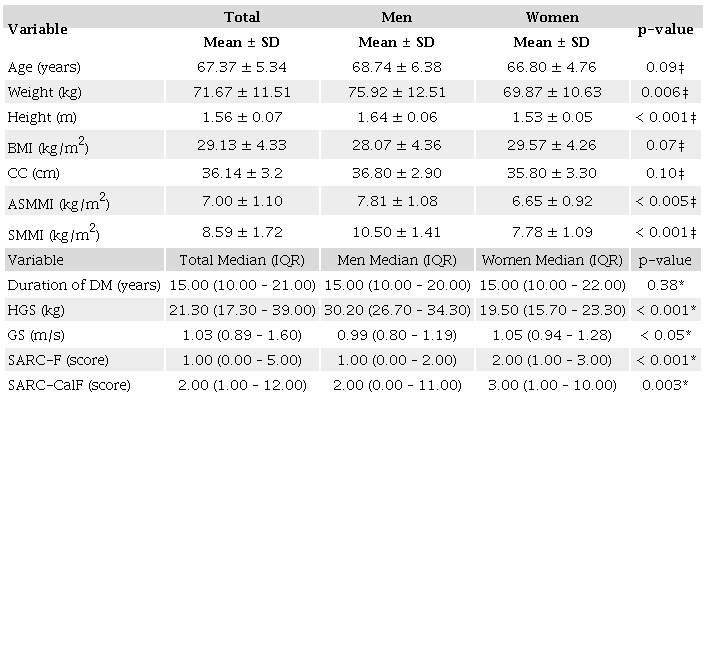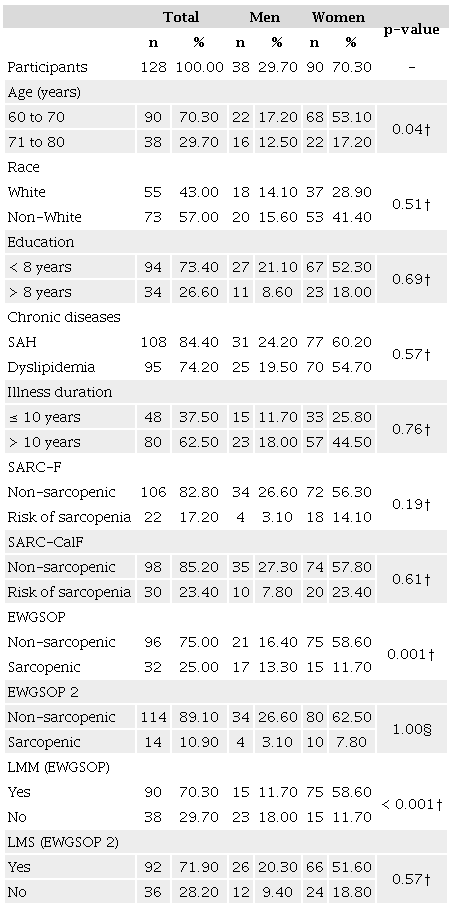 A total of 138 older men and women diagnosed with DM2 were recruited. The exclusion criteria for this convenience sample were: decompensated chronic renal failure (serum creatinine ≥ 2.0 mg/dL), neuromuscular diseases, a previous history of stroke and motor sequelae, cognitive impairment that could prevent comprehension of the questions and/or communication with the researchers, active malignant neoplasm, body mass index ≥ 40 kg/m2, or physical limitations that could prevent anthropometry and bioelectrical impedance testing. The final sample consisted of 128 participants who met the inclusion criteria: age 60 to 80 years and diagnosed with DM2 for > 12 months.