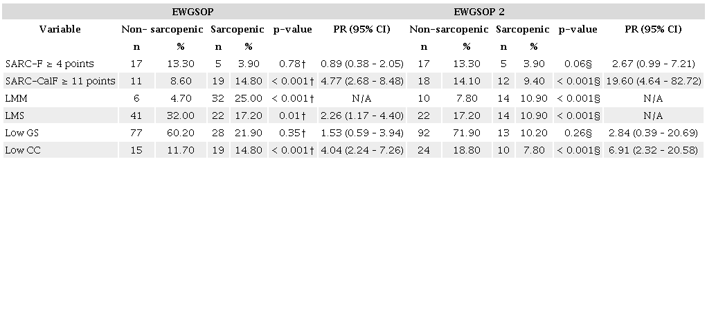 According to EWGSOP and EWGSOP 2 criteria, the prevalence of sarcopenia was 25.00% and 10.90%, respectively. In both sets of criteria, the prevalence differed according to sex, being higher among men for the EWGSOP (p = 0.001) and higher among women for the EWGSOP 2 (although not significantly so).