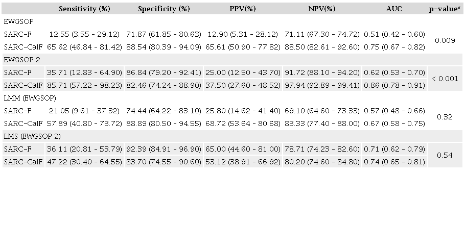 Table 3 shows the results of the sensitivity/specificity analysis, positive predictive value, negative predictive value, and AUC for the SARC F and SARC CalF in comparison with the diagnostic criteria for sarcopenia and probable sarcopenia (low muscle mass [EWGSOP] and low muscle strength [EWGSOP 2]). For the SARC F, sensitivity varied between 12.55% (95% CI, 3.55–29.12) and 36.11% (95% CI 20.81–53.79) and specificity varied between 71.87% (95% CI 61.85–80.63) and 92.39% (95% CI 84.91–96.90). For the SARC CalF, sensitivity varied between 47.22% (95% CI 30.40–64.55) and 85.71% (95% CI 57.22–98.23) and specificity varied between 82.46% (95% CI 74.24–88.90) and 88.89% (95% CI 80.50–94.55).