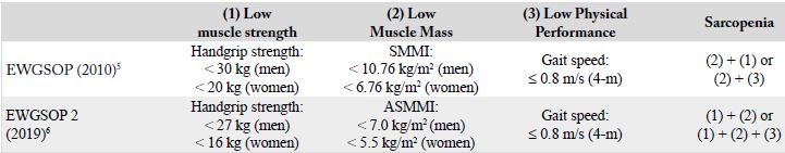 Two sets of criteria were used to diagnose sarcopenia: EWGSOP, published in 2010, and the EWGSOP 2, published in 2018. According to the EWGSOP, sarcopenia is defined as low muscle mass associated with low muscle strength and/or low physical performance. According to the EWGSOP 2, sarcopenia is defined as low muscle strength associated with low muscle mass; when combined with low physical performance, it is considered severe sarcopenia.