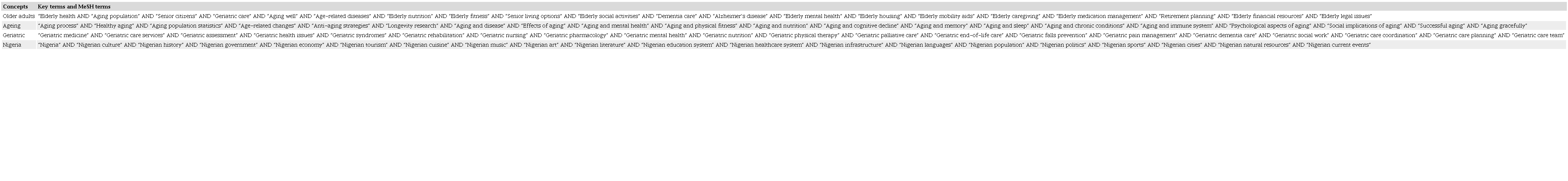 Four electronic databases will be searched to identify studies from published and grey literature on geriatrics in Nigeria from inception until 2023. The population of interest will be older adults aged > 60 years. The publication period will be from 1960 to 2023. The databases will include PubMed, MEDLINE, Google Scholar, and African Journal Online. The primary investigator, content experts, and the librarian collaborated to identify search phrases. The agreed-upon search terms include: “Elderly persons” OR “Older person” “Older people” OR “Older Adults” OR “Aged” “Ageing” “Aging” OR “Geriatric” AND “Nigeria”. The search strategy will be translated into the various syntaxes supported by each database. Subject headings (eg, MeSH), Boolean operators, proximity operators, truncation, and phrase searches will be employed as needed (Table 1).