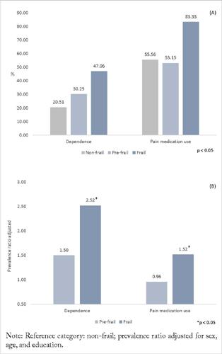 Regarding the relationship between frailty and perceived signs/symptoms of suffering in the year before death, compared to the non-frail group at baseline, the frail group had higher rates of dependency (prevalence ratio = 2.52; 95% CI 1.20-5.32) and pain medication use (prevalence ratio = 1.52; 95% CI 1.06-2.17) (Figure 1).