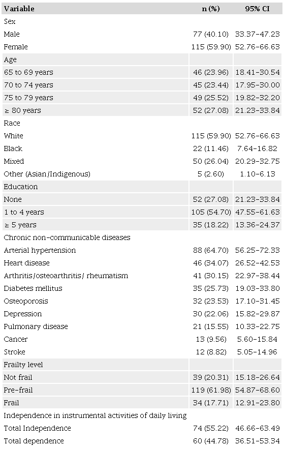 Results: A total of 192 family members participated (64.58% women). The mean age of the deceased was 80.59 years (59.90% women; 27.08% with no formal education). In the year before death, 51.34% had fatigue, 43.68% had pain, 42.63% had anorexia, 41.27% had dyspnea, and 41.21% suffered a fall. Most died either at home (52.10%) or in the hospital (41.66%). The most frequent causes of death were circulatory and respiratory system diseases and neoplasms; 29.63% died suddenly, 51.05% were admitted to an intensive care unit, 52.60% were hospitalized, 58.76% used pain medication, and 27.13% received home care. Relative to non-frailty, baseline frailty was associated with dependence (prevalence ratio = 2.52) and pain medication use (prevalence ratio = 1.52) in the last year of life.