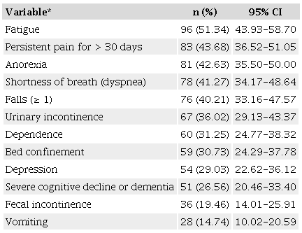 In the present sample, the most commonly reported sign/symptoms of suffering in the 12 months before death were fatigue, persistent pain, anorexia, dyspnea, falls, and urinary incontinence. Those reported in a similar population- based survey in São Paulo were pain (78.4%), fatigue (68.0%), dyspnea (60.0%), depression (58.2%), anorexia (58.0%), and urinary incontinence (57.5%).7 Pain, fatigue, and depression lasted for ≥ 6 months, and the most reported signs/symptoms of suffering in the last week of life were fatigue, urinary incontinence, anorexia, dyspnea, and pain.7 An Irish study found that in the year before death, 50% of older adults felt pain regularly, 45.0% were depressed, and 41.0% had fallen in the last 2 years.5 In a survey of family members or other proxies of deceased older adults in the United States from the Health and Retirement Study cohort (1998-2010), Singer et al.6 found the following proportions of symptoms: anorexia (64.0%), fatigue (62.4%), pain (57.5%), dyspnea (52.6%), depression (51.4%), periodic confusion (47.9%), urinary incontinence (45.8%), and vomiting (11.8%).