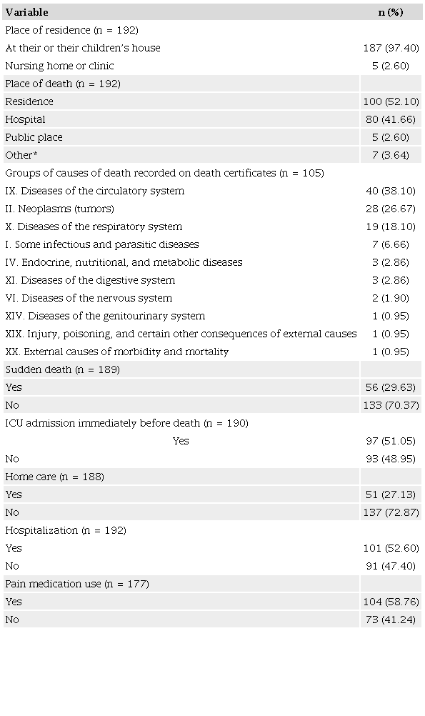 Most interviewed family members were women (n = 124; 64.58%); 58.33% were children, 17.19% were spouses and 24.48% were other relatives (grandchildren, great-grand-children, nephews, and cousins) of the deceased. The mean interviewee age was 57.22 (SD, 14.94) years; 48.94% were aged 40-59 years, 39.89% were ≥ 60 years, and 11.17% were aged 19-39 years. Regarding years of education, 41.15% had ≥ 9, 32.29% had 5-8, 22.40% had 1-4, and 4.16% had none (data not shown).