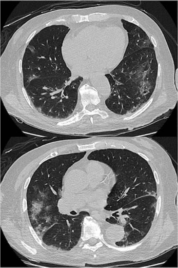 In the hospital emergency department, severe dehydration, mental confusion, pneumonia, and a grade IV pressure lesion in the sacral region were diagnosed. Complementary tests ruled out cardiac arrhythmia or fractures; bilateral pneumonia was found in chest computed tomography (Figure 1).