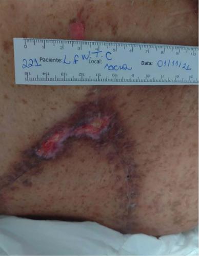 The patient’s total hospital stay was 62 days and, due to mobility impairment, he was referred to a transitional care unit for rehabilitation. By the time he reached this new unit, he had lost 13% of his usual weight, had global muscle weakness, handgrip strength of 10 kgf, imbalance, and sarcopenia, in addition to a postoperative wound in the sacral region (Figure 2). After 25 days, he was discharged lucid and alert, having gained 5.2 kg, with good sphincter control and walking with little unilateral assistance.