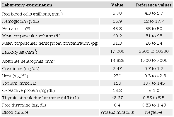 Blood tests showed kidney failure, hypernatremia, and hypothyroidism (Table 1). A family member reported that the patient, except for previous hypothyroidism, was independent, autonomous, active and healthy; he was using a single medication, levothyroxine (188 mcg per day).