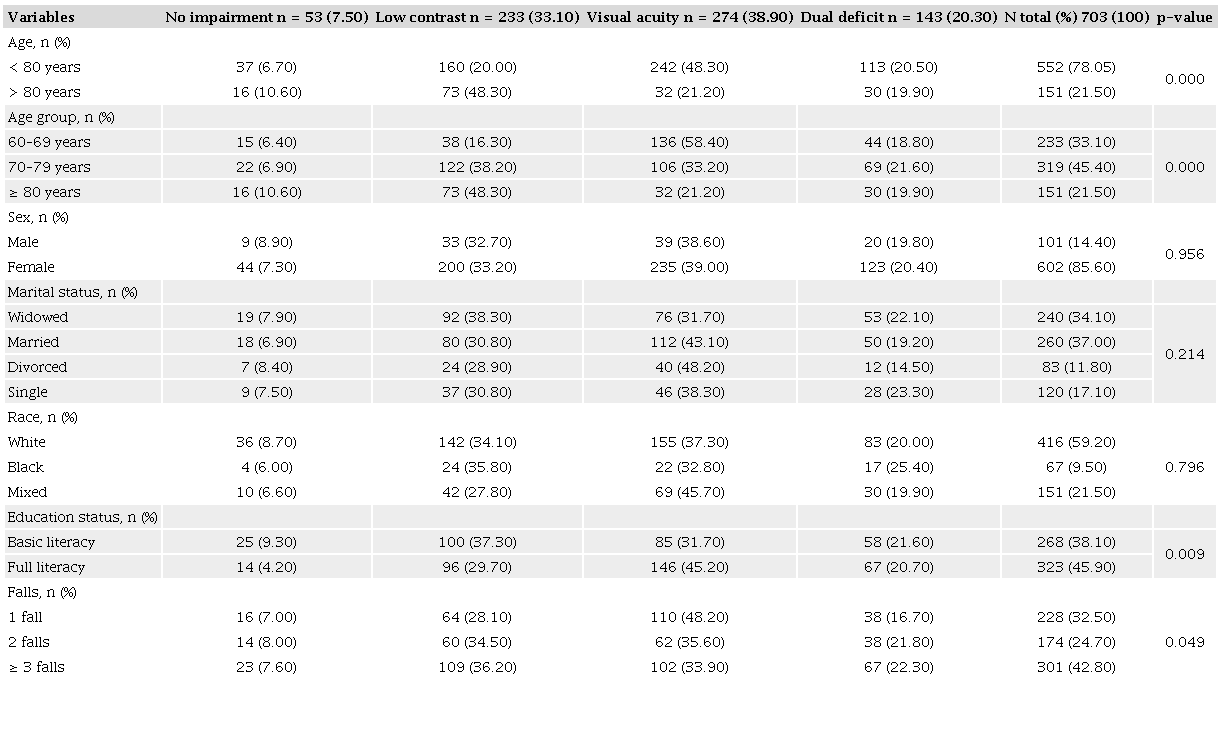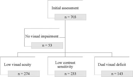 Of the total sample of 703 older adults, 650 (92.40%) had some type of visual deficit (visual acuity, low contrast sensitivity, or dual visual impairment). There was a higher prevalence of low contrast sensitivity among those > 80 years of age (48.30%). Of the 602 women, 72.00% had some type of visual impairment (low visual acuity or low contrast sensitivity) (Table 1). The sample was classified into 3 groups: low visual acuity, low contrast sensitivity, and dual visual impairment (Figure 1).
