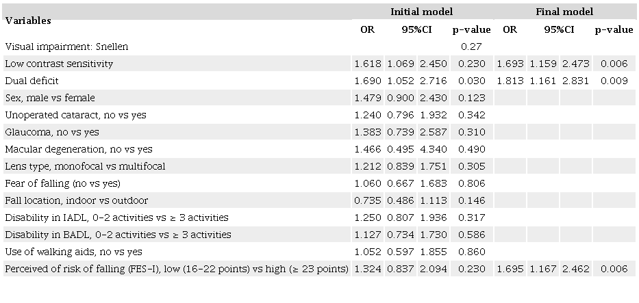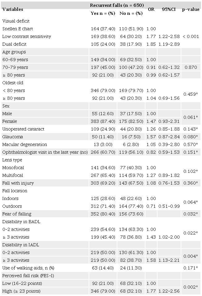 Resultados: Baixa acuidade visual, baixa sensibilidade ao contraste e duplo déficit visual foram associados a quedas recorrentes com odds ratio — OR 1,85, frequentemente mais prevalente entre os idosos longevos. Cerca de 90,00% dos idosos relataram usar óculos e 63,80% usavam lentes multifocais. O duplo déficit visual foi identificado em 143 (20,30%) participantes. Nos modelos de regressão logística multivariados, verificamos que as variáveis preditoras para queda recorrente foram a baixa sensibilidade ao contraste (intervalo de confiança — IC95% 1,15–2,47), duplo déficit (IC95% 1,16–2,83) e a autopercepção do risco de cair (IC95% 1,16–2,46) medido pela Falls Efficacy Scale-International.