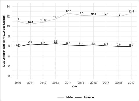 Considering the above, the aim of this study is to assess the 10-year historical trend of AIDS detection rates in older patients by sex, federative unit/region of residence, and the epidemiological characteristics of new AIDS cases in older adults in Brazil from 2010 to 2019, comparing them with AIDS cases detected in younger adults (ages 20 to 59).