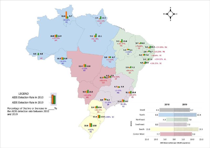 To illustrate the comparison of AIDS detection rates by federative unit and region of residence between the years 2010 and 2019, a thematic map was developed using QGIS 2.18.2 software.
