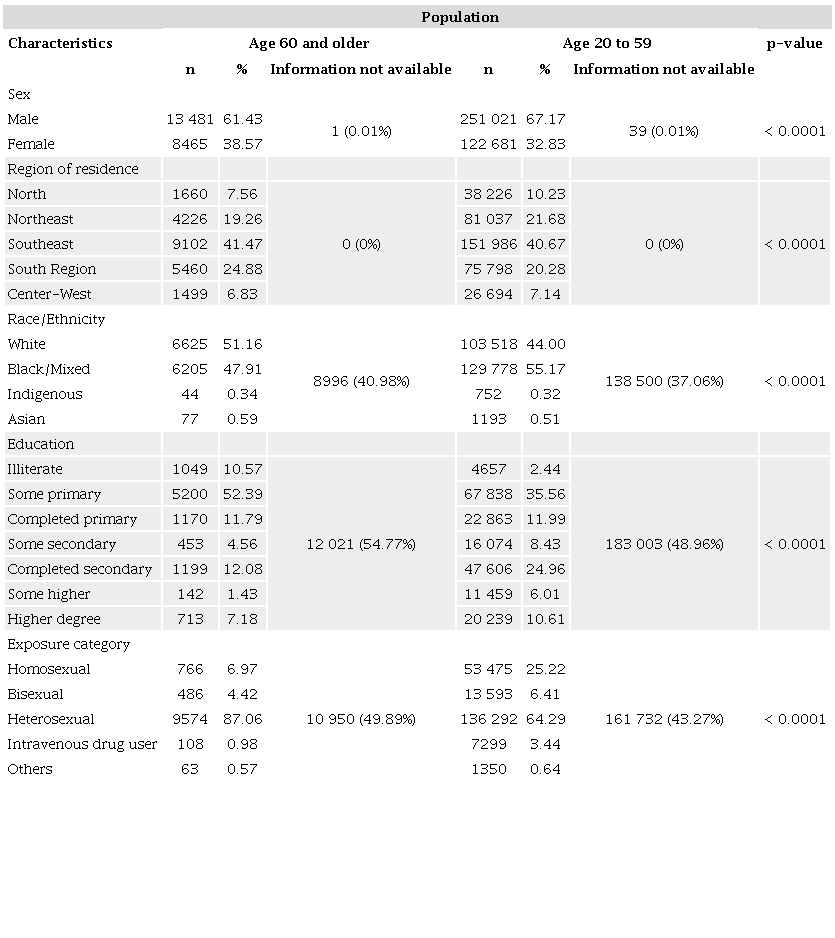 The characteristics of AIDS cases in the populations aged 60 and older versus 20 to 59 are presented in Table 1. The proportion of new AIDS cases in women was higher among those aged 60 and older (38.57%) compared to those aged 20 to 59 (32.83%) (p < 0.000). Notably, the South region exhibited a difference in the proportion of detected AIDS cases, with those aged 60 and older (24.88%) having a higher fraction of cases compared to those aged 20 to 59 (20.28%) (p < 0.000). White race/skin color was the most frequent ethnicity among AIDS cases in the latter population, accounting for 51.16% of cases. This proportion differed significantly from the geriatric population, where the highest proportion was among Black or mixed-race individuals (55.17%) (p < 0.001). Furthermore, 62.96% of adults diagnosed with AIDS had low education levels, ie, were illiterate or had not completed primary education. In contrast, the same level of education was diagnosed in only 38.00% of cases in the geriatric population (p < 0.0000). Regarding the exposure category, the heterosexual category predominated among both the 20-to-59 and 60-and-older populations, with a higher proportion among the latter (87.06%, p < 0.000).