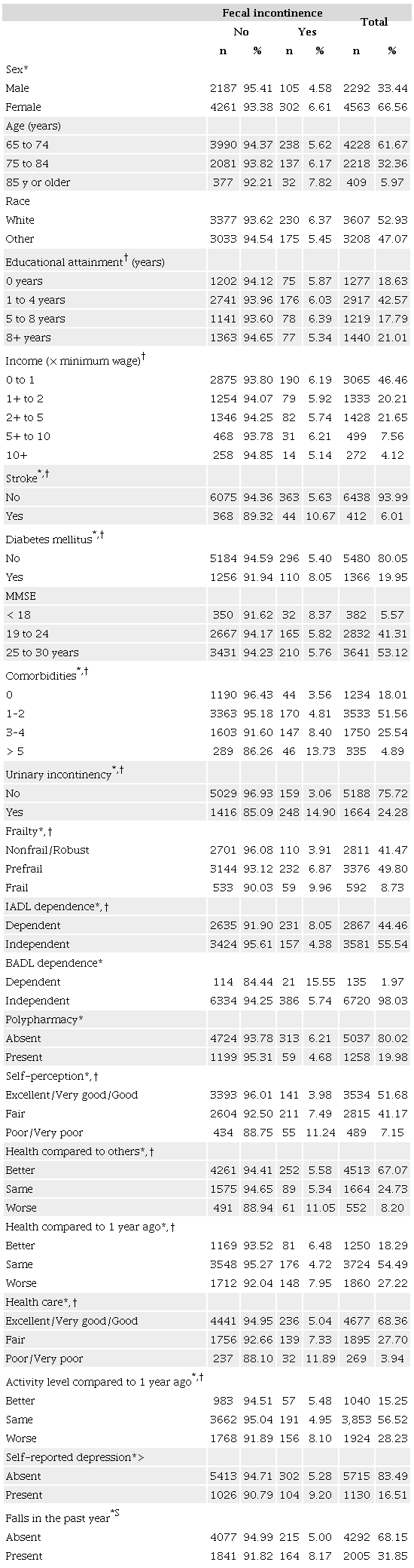 Resultados: No total, 6855 indivíduos foram avaliados; 66,56% eram do sexo feminino, 52,93% brancos e a média de idade de 73,51 anos. A prevalência de incontinência fecal foi de 5,93% e estava associada com pior cuidado com a própria saúde [OR 1,78 (1,08–2,96)], dependência para as atividades básicas de vida diária [OR 1,29 (1,01–1,95)] e incontinência urinária [OR 4,22 (3,28–5,41)]. Além disso, observou-se que a ausência de polifarmácia [OR 0,61 (0,44–0,85)] foi identificada como associação de proteção.