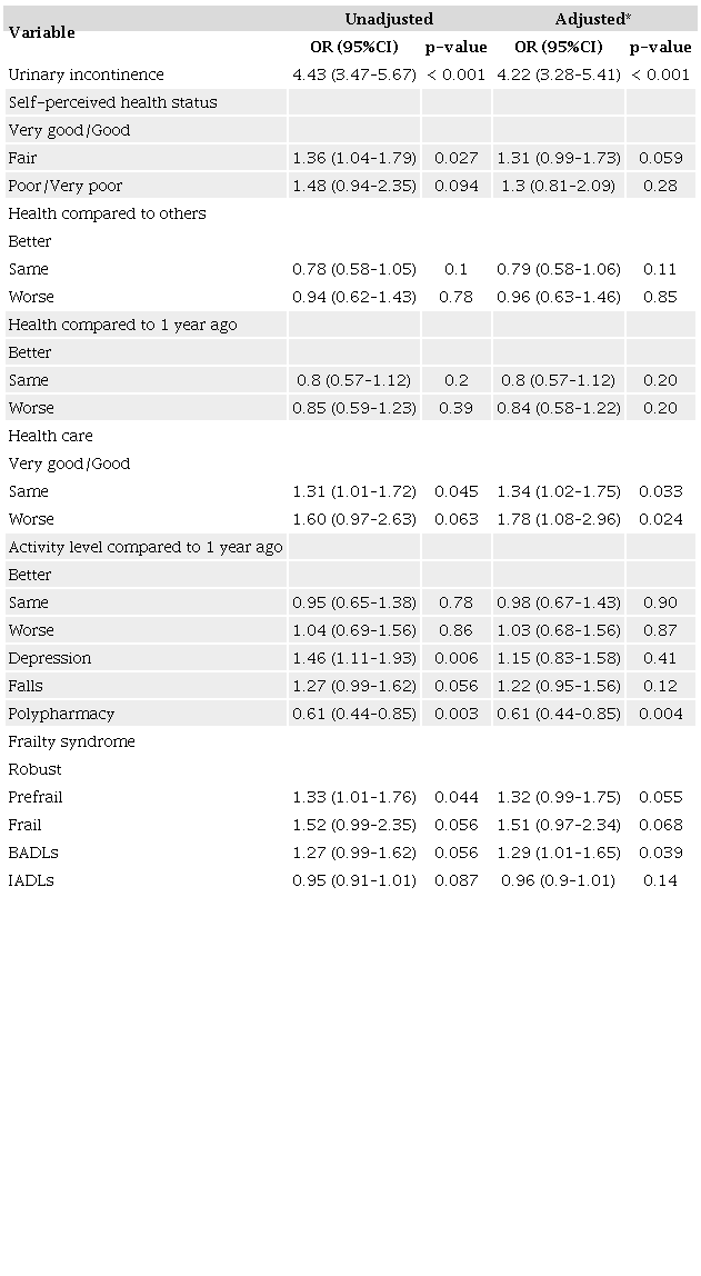 Bivariate analysis showed an association between FI and the following conditions: falls, worse self-perception of health, worse perception of health when compared to that of others, worse perception of health when compared to one’s own health a year ago, perception of poor care for one’s own health, worse activity level when compared to a year ago, and self-reported diagnosis of depression. Among the variables of unknown directionality, associations were observed between FI and UI, functional dependence (IADL and BADL), polypharmacy, and the frailty syndrome (Table 1).
