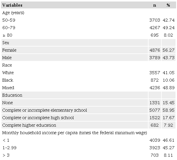 A total of 8665 individuals aged ≥ 50 years were interviewed, of whom 56.27% were female, 49.24% were aged 60-79 years, 48.89% self-reported their race as mixed, 58.95% reported primary education, and 46.61% reported a family income < 1 x the federal minimum wage (Table 1). Daily V consumption was reported by 45.01%, daily F consumption was reported by 42.33%, and daily F+V consumption was reported by only 26.19%.