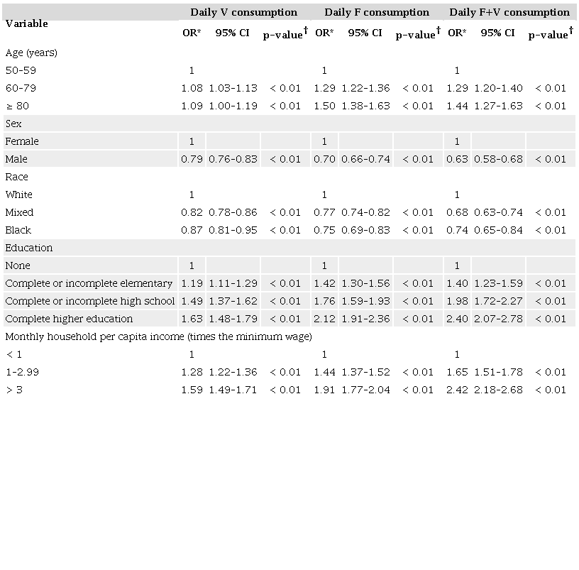Results: Individuals who had completed higher education (OR 2.40; 95% CI 2.07–2.78), whose income was > 3 times the minimum wage (OR 2.42; 95% CI 2.18–2.68), and those aged > 80 years (OR 1.44; 95% CI 1.27–1.63) were more likely to consume fruits and vegetables. However, men (OR 0.63; 95% CI 0.58–0.67), Blacks (OR 0.74; 95% CI 0.65–0.84), and people of mixed race (OR 0.68; 95% CI 0.63–0.73), were less likely to consume fruits and vegetables.
